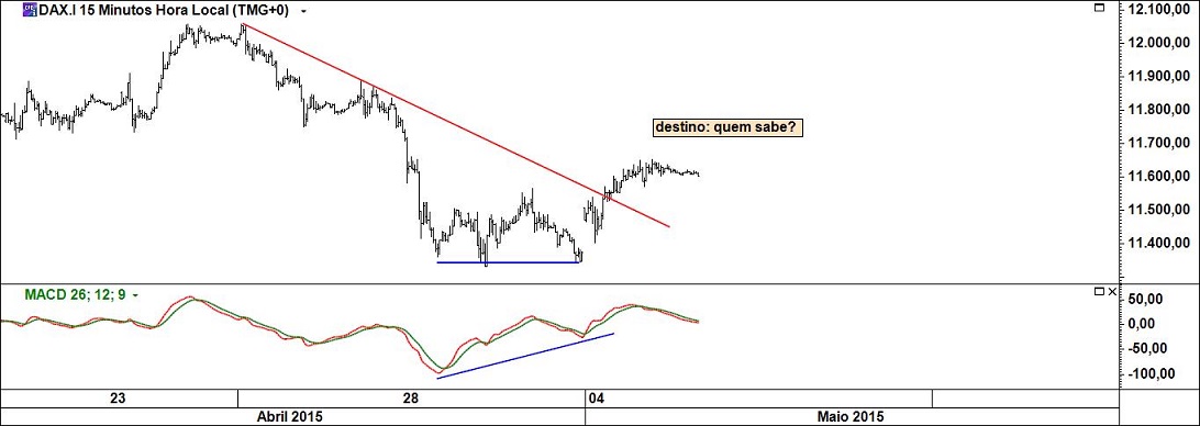 Colocar o gráfico do dax com o macd chamando a atenção para a divergência foi o modo "mais simpático" de dar a piada: tantos e tantos usam esse tipo de indicadores, falam em divergências como se não fosse a coisa mais natural dos mercados e agora não dizem nada!!?? Divergência, aliás, que também era possível ver com o rsi e o estocástico, mas decidi usar o que se diz ser menos impulsivo quando comparado com aqueles.