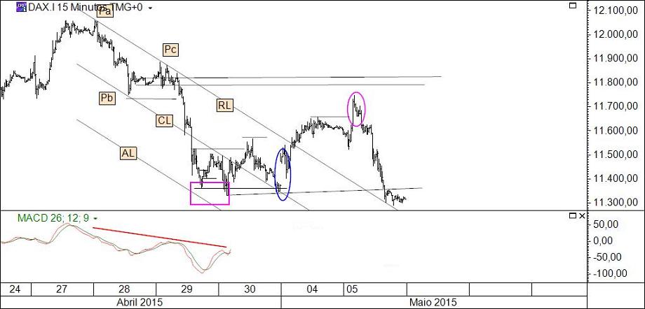 Já estava à espera que um colega forista se referisse à circunstância d´O Alquimista usar um indicador atrasado como o macd, ele que apregoa usar indicadores avançados. O isco funcionou às mil maravilhas: "vou colocar aqui um gráficozito com o macd, alguém há-de vir dizer alguma coisa e, nessa altura, pumba! meto ao barulho a 2ª tese e sua demonstração". A cereja no topo do bolo foi tratar-se de um mercado tão querido e que suscita tantas paixões: o dax.