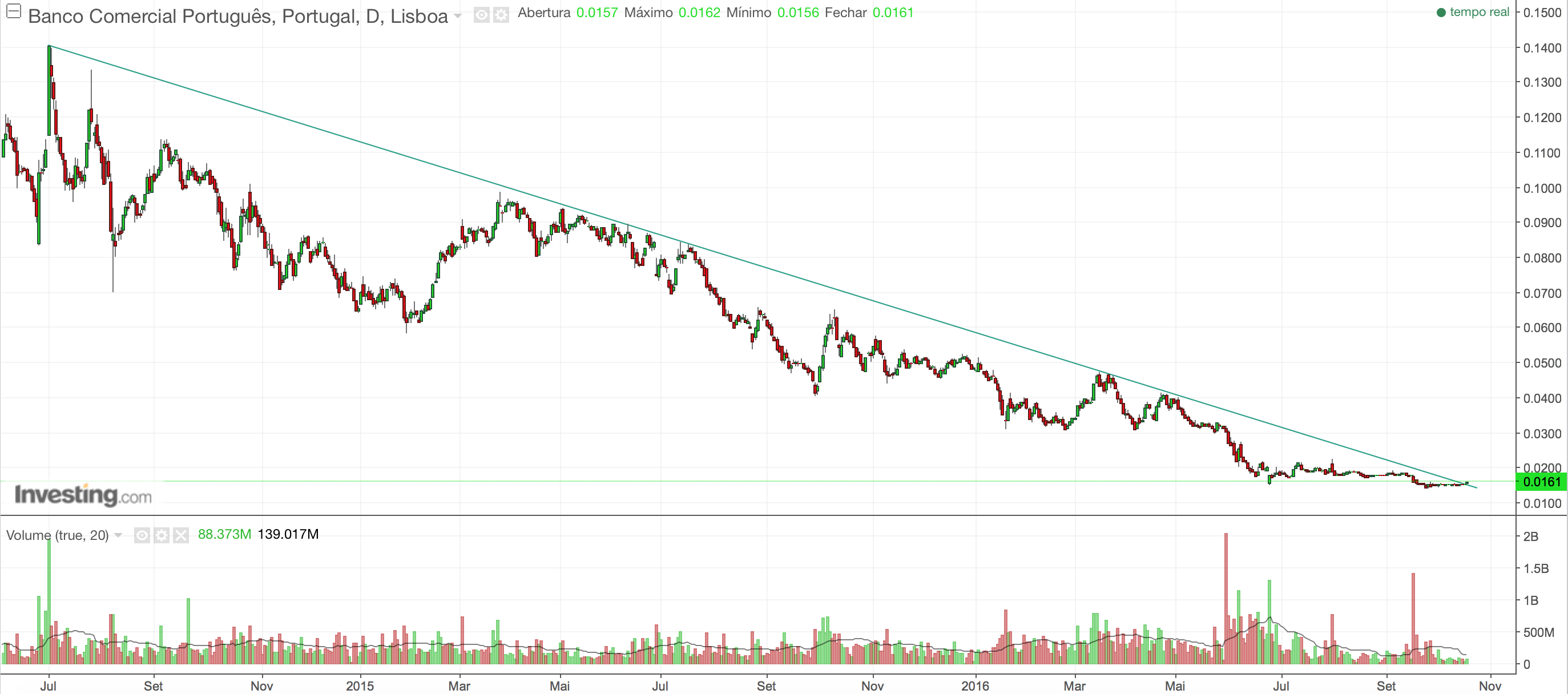 Peço que alguém exiba no Fórum 2 gráficos diários da cotação do BCP, mostrando a LTD traçada desde 11/06/2015; um dos gráficos deveria, com "zoom", mostrar pormenorizadamente por onde passa a referida LTD no atual mês de outubro.
