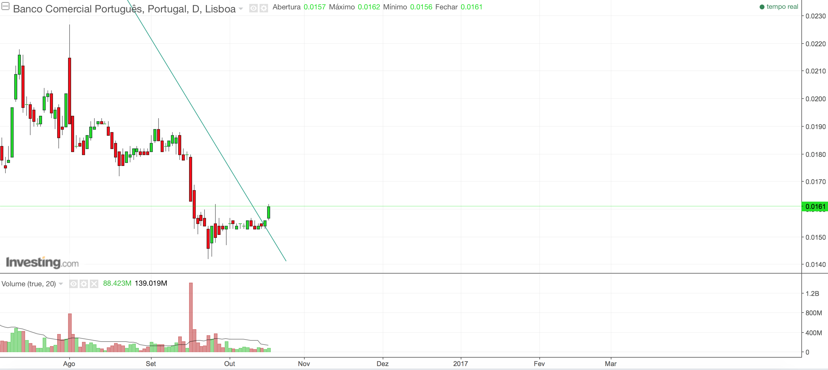 Tinha já resolvido entrar novamente no BCP se ele cotasse 0,0158 euro, ou seja, se rompesse o referido retângulo, em cima. Hoje, desgraçadamente, só olhei para o BCP há poucos minutos ...