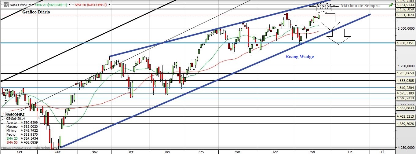 Deixo aqui os gráficos mais representativos do chamado busílis da questão; onde está o Wally? Diga-se, o Topo! É certo que encontra-lo é difícil, mas tem sempre a sua piada tentar descobri-lo, quem sabe o NASDAQ tenha essa resposta... no mínimo terá uma correção. É preciso ter em conta que a linha superior destas Wedges está a coincidir com a zona dos Máximos de sempre. Não há coincidências. (E olha um duplo topo também...)