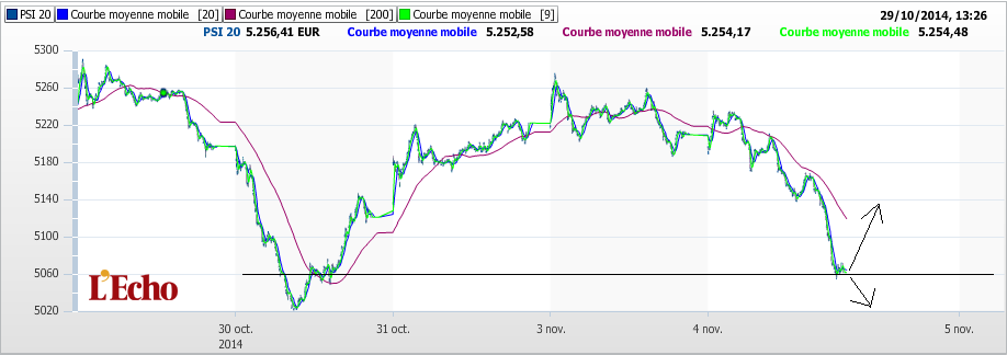 A não formação de um novo mínimo assenta na premissa de que o movimento iniciado no dia 8 de setembro terminou no dia 16 de outubro, o movimento seguinte terminado no dia 29 de outubro seja uma W1 e o movimento de hoje seja a W2. Para isso acontecer o índice não poderá descer os 4856,24 (mínimo do ano) e terá de ultrapassar os 5290,81 (linha verde horizontal).