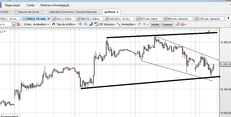 Estou portanto com uns 100 pontitos de lucro. Quando abri a posição coloquei imediatamente (com o DAX não se brinca) stop nos 9100 e limite nos 9390.