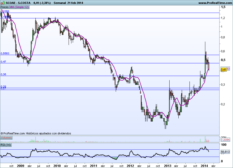 Boa noite pessoal, hora bem, eu tinha dito que compraria só nos 38 ou 32, mas penso que não vai lá chegar, ontem num dia mau para a bolsa Nacional, a Soares da Costa mostrou que o suporte entre os 40 e 41 é forte, o que me levou a comprar hoje a 42 o que tinha vendido á dias atras.