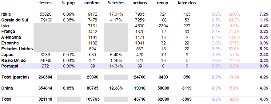 Nota: em Portugal fizeram-se cerca de 280 testes, dos quais cerca de 50 se aguarda resultado (último relatório aqui).