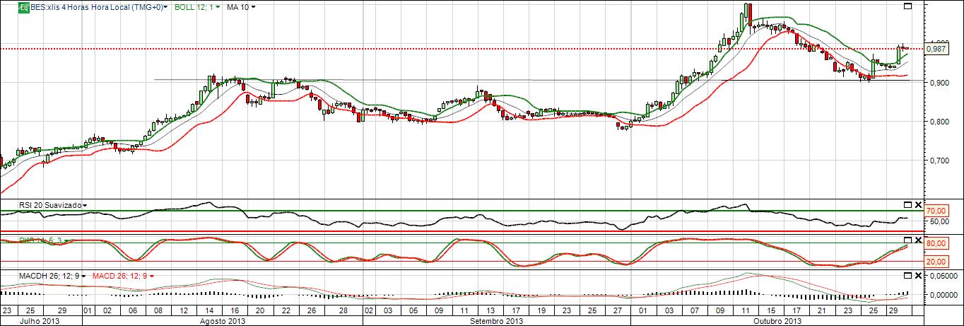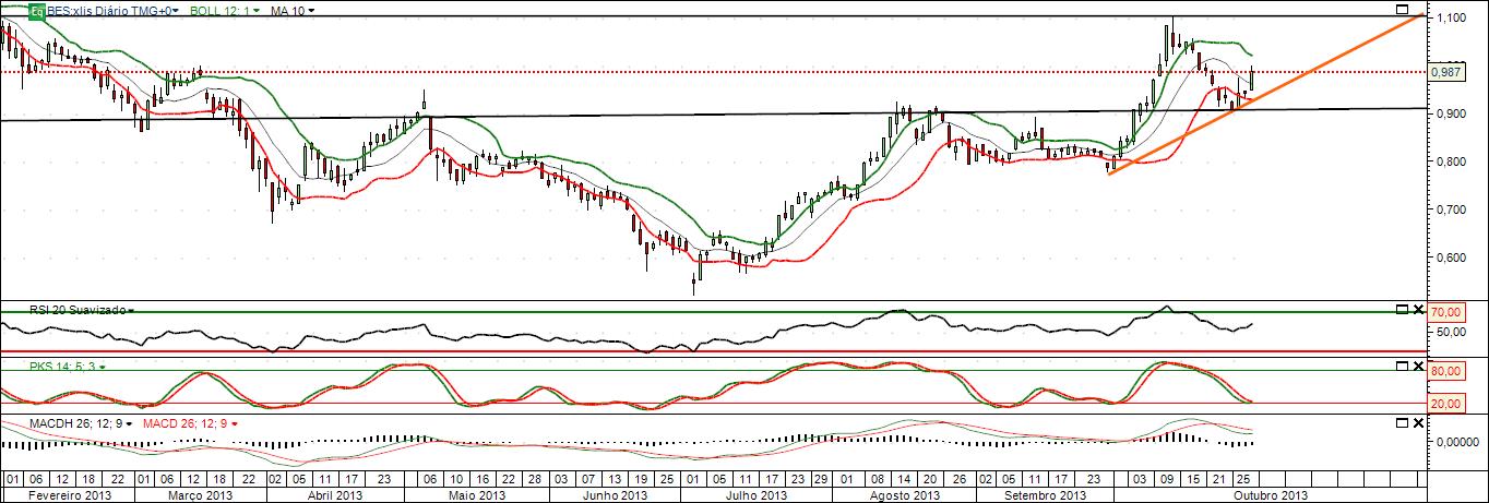 Da minha analise o BES está num intervalo entre os 0,90 e 1,10 mas face aos indicadores que me auxiliam a tomada de decisão penso que está com força para rumar até à próxima resistência.