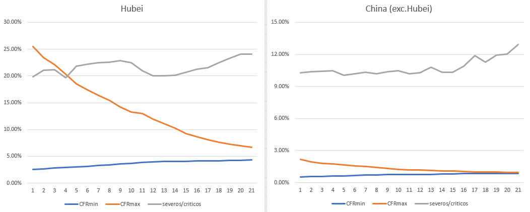 Em anexo, a evolução da situação dentro e fora de Hubei desde que a China/OMS começaram a facultar dados diários separados, ou seja, as três últimas semanas. As taxas de letalidade estão (e têm estado) a convergir para valores claramente distintos, para cerca de 5% em Hubei e para cerca de 0.9% fora de Hubei. A linha a cinzento indica a percentagem de casos severos+críticos entre os casos por resolver e que também apresenta valores distintos (observe-se que as escalas são diferentes). As linhas a azul e laranja oferecem estimadores simples para a taxa de letalidade (a menos que exista uma alteração significativa da situação, que é possível mas que para já não se vislumbra, a taxa de letalidade efectiva terá de estar entre estes valores). Considere-se também que a China está (alega estar) a rastrear alargadamente os contactos dos infectados, independentemente de manifestarem sintomas (sendo que apenas cerca de 12% dos testados revelam positivos). Sendo sempre de admitir que exista uma sub-representação dos assintomáticos, os dados não sugerem nem substanciam para já isso (alegar que existem muitos mais assintomáticos é um exercício de adivinhação para o qual não existe sustentação nem evidência clara, pelo menos para os países que estão a fazer rastreios alargados a todos os contactos de infectados, que são vários).