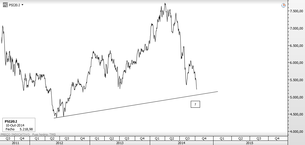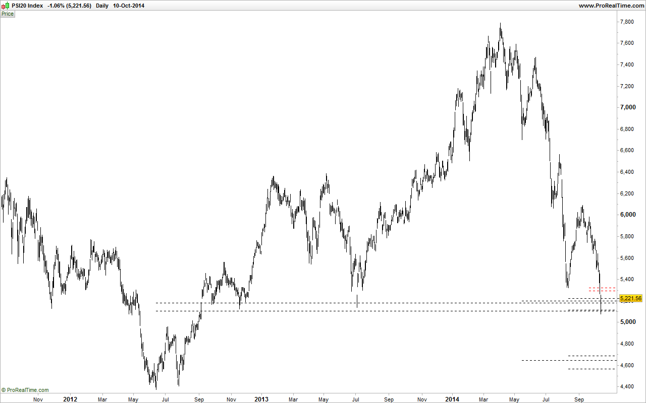 b) dado que nao foram fechados os gaps da altura da acção do Portas, no movimento anterior associado á falência do BES terminado em Agosto, o suporte da zona de hidden lows pelos 5100-5300 pode não ser suficiente para retere o movimento da onda 5.