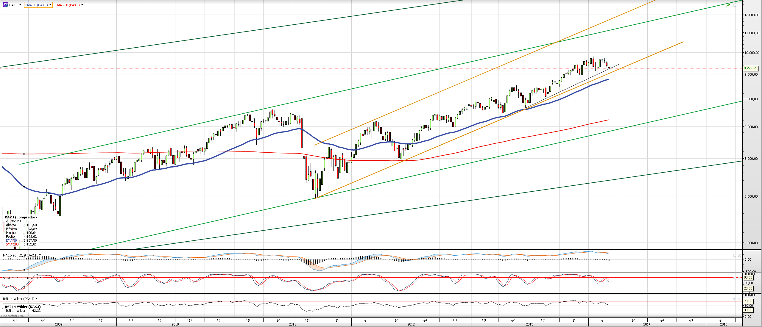 No semanal, temos aí um suporte desde o meio do ano passado na mesma zona ~9250, mas o canal laranja passa perto, ligeiramente abaixo nos ~9150.