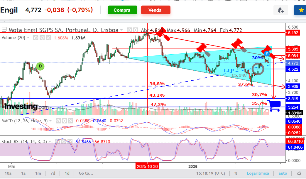 MADPIX Escreveu:Errei quando no inicio da semana referi que na quarta feira iria aos 5€, ontem andou perto, por 3 cêntimos, ontem entrei com tudo na queda e alavanquei, 95% por fesada, confesso, os 5% foram para o único indicador que me fez alavancar desta forma foi no MACD 26, assinalado no gráfico, também pelos sinais de acumulação das ultimas semanas. O meu target seria apontar ali para a linha superior do megafone, mas isto já é fesada a mais, vou mas é apertar os stops!