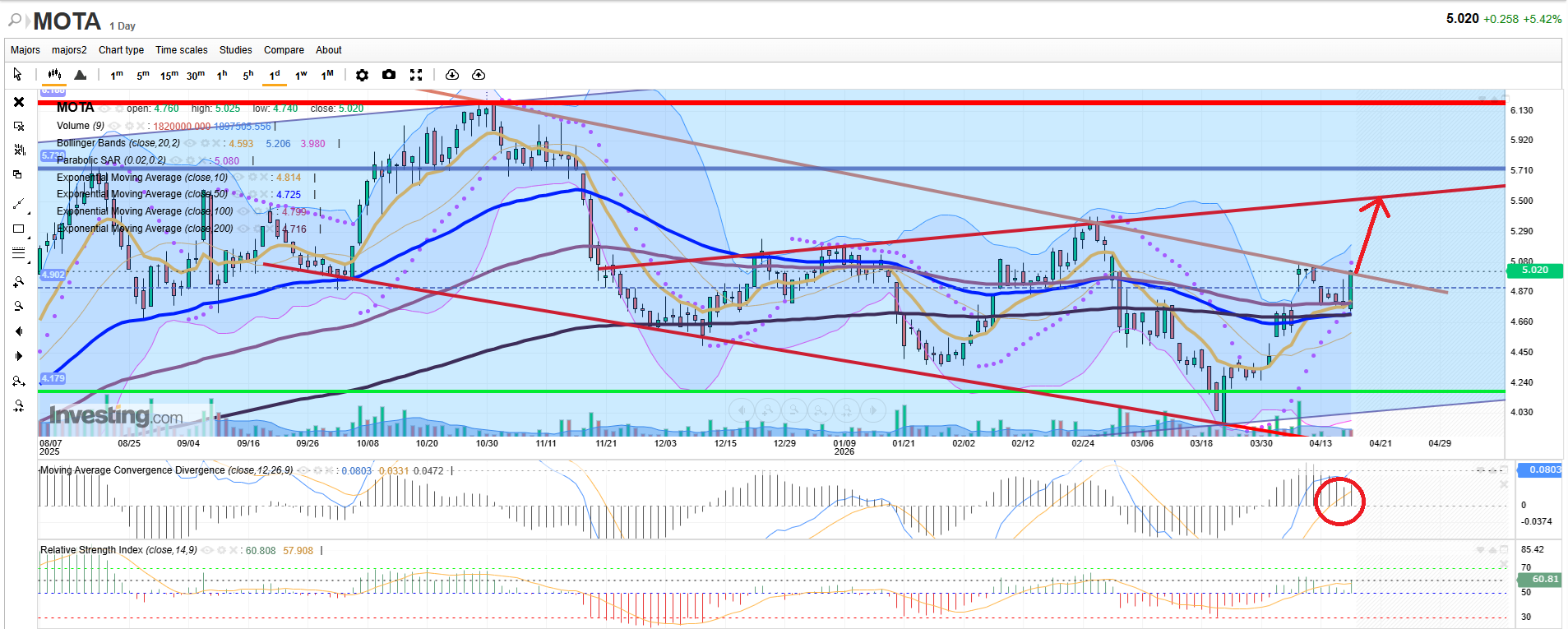 Errei quando no inicio da semana referi que na quarta feira iria aos 5€, ontem andou perto, por 3 cêntimos, ontem entrei com tudo na queda e alavanquei, 95% por fesada, confesso, os 5% foram para o único indicador que me fez alavancar desta forma foi no MACD 26, assinalado no gráfico, também pelos sinais de acumulação das ultimas semanas. O meu target seria apontar ali para a linha superior do megafone, mas isto já é fesada a mais, vou mas é apertar os stops!