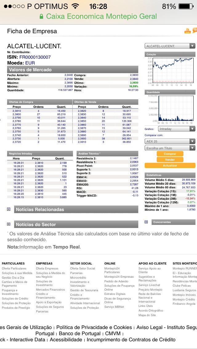 Penso que, até à apresentação de resultados a Alcatel irá corrigir do efeito abrupto das últimas quedas, podendo antes da apresentação, cotar entre os € 2,48; € 2,60....