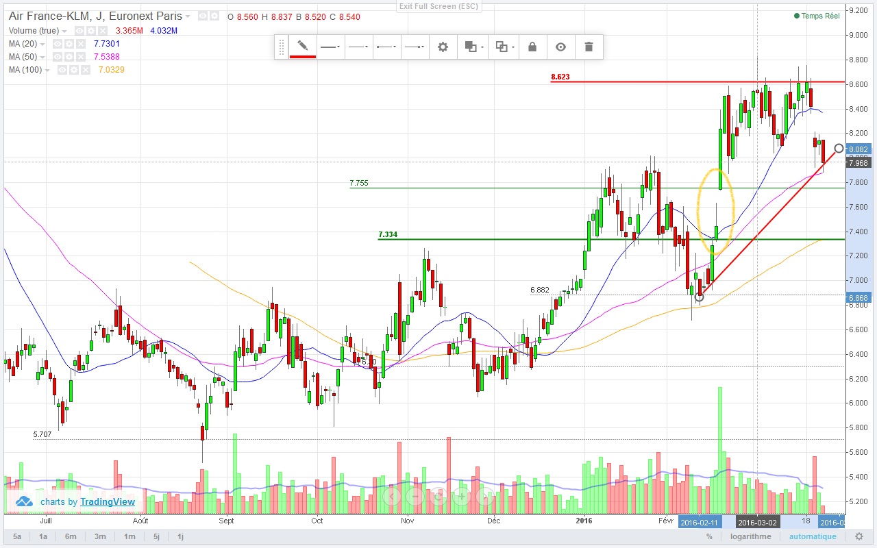Depois duma queda abrupta de 24%, a KLM subiu mais de 30% em mês e meio, estando de novo em maximos.