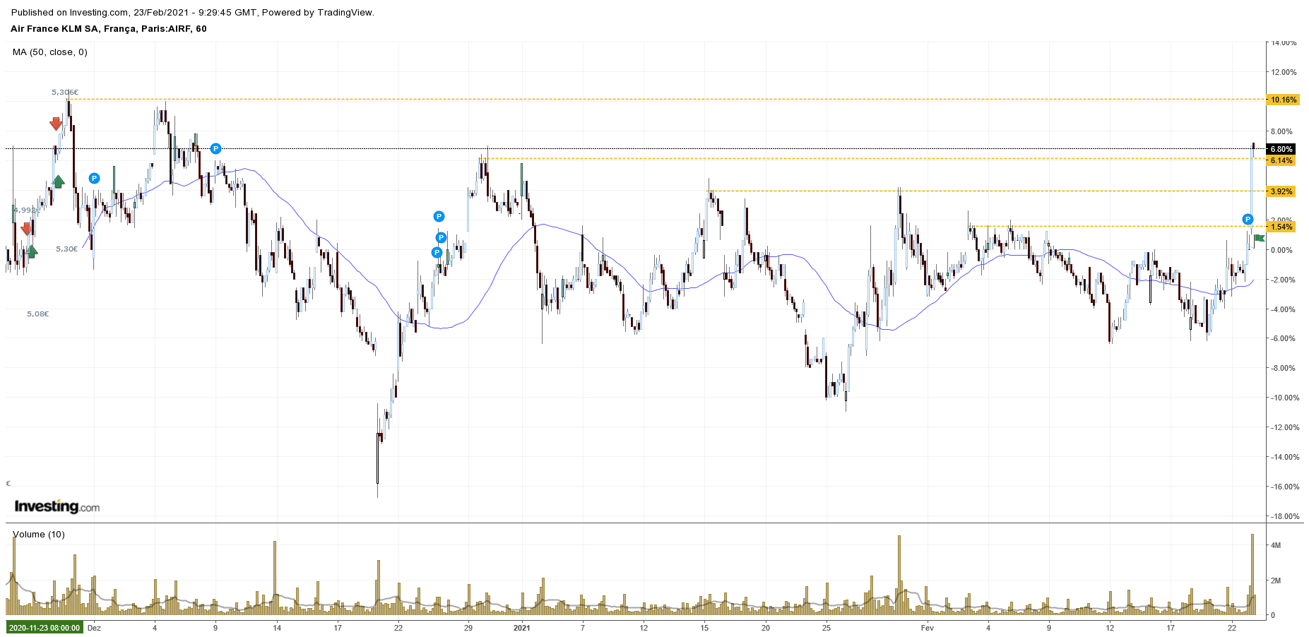 Por agora, coloquei um range de negociação na Air France/KLM, nos 5,07€/11,76€ (não serve de aconselhamento de investimento).