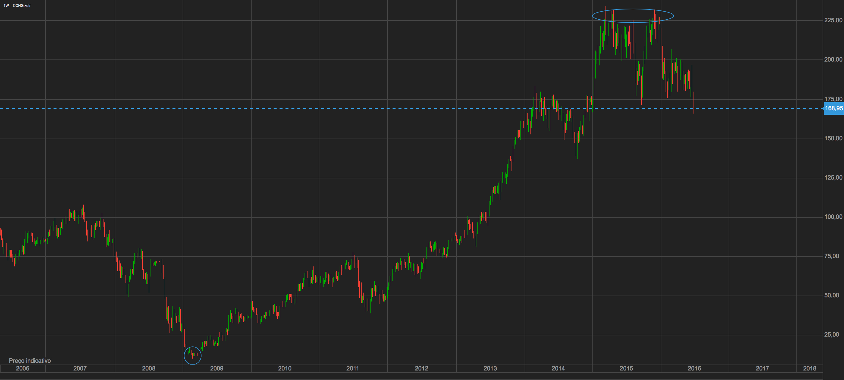 Desde Março 2009, altura em que devido à crise a maior parte das acções bateram no fundo, a Continental foi das empresas que mais espectacularmente recuperou. Como se pode analisar no gráfico abaixo, desde então a cotação subiu a grande velocidade, tendo atingido o pico de 231€ aproximadamente em Abril e Novembro de 2015.