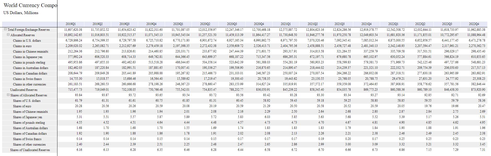 É normal que existam gradualmente maiores reservas de outras moedas no mundo vs o USD porque muitos países têm economias e influencia cada vez mais representativas (mas nada que indique o fim do USD como global currency). Na tabela que partilhei aumentaram os yuans(Renminbi) e other currencies (rupia suponho que influencia muito).