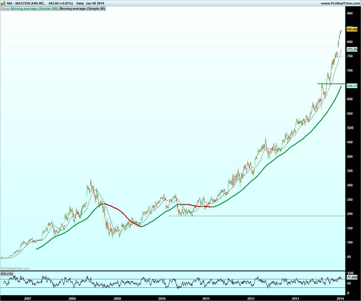 Comparando o gráfico de MA desde o IPO (> 400% em 2 anos) com o de V vê-se que a VISA tem estado a subir ainda mais depressa que MA.