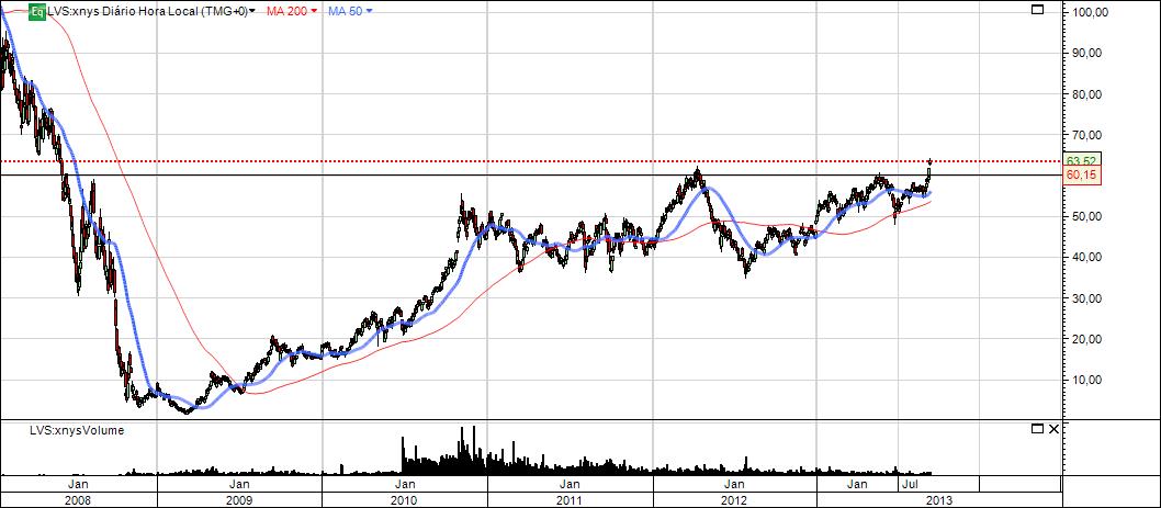 LVS registou hoje um novo maximo dos ultimos anos e caminha rapidamente para quebrar a barreira dos $60. Tecnicamente muito Bull.