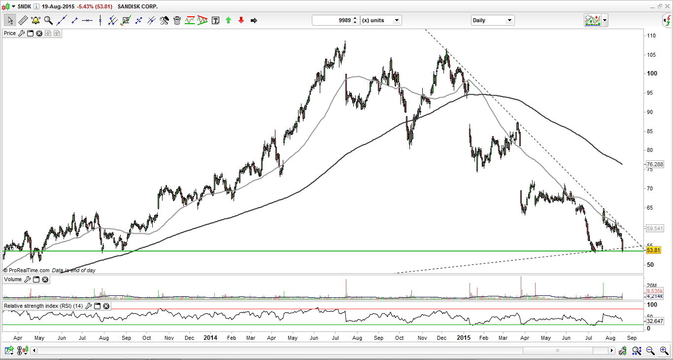 No gráfico de longo prazo podemos observar que o bull market da SanDisk tem uma LTA já com um ano e meio de vida, testada várias vezes, alguma das quais parecendo dar sinais de quebra, mas o certo é que ela tem resistido sempre.