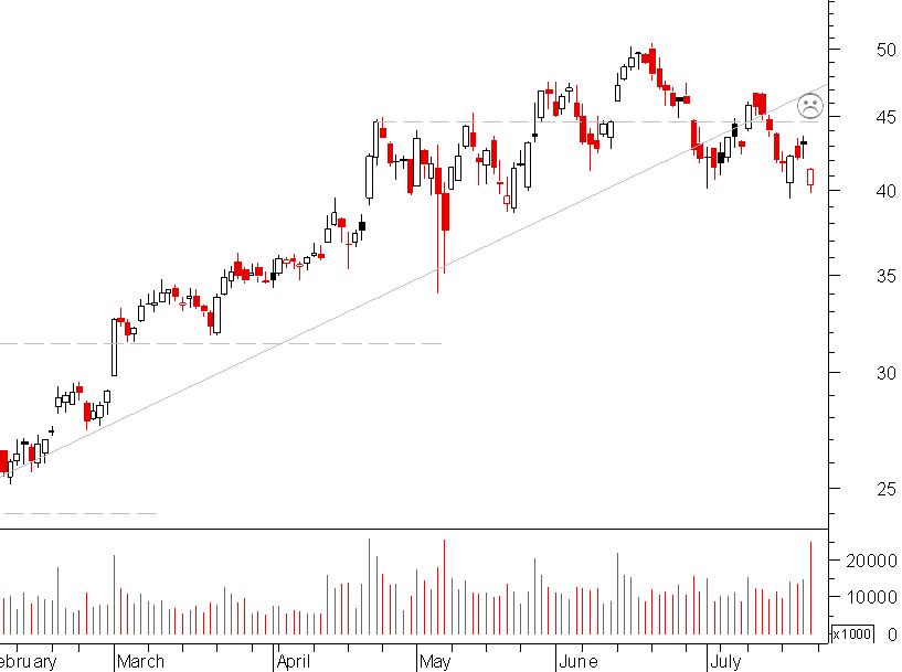 Actualmente, a acção encontra-se perante um novo cenário de teste à LTA. No espaço de um mês é a terceira vez que a LTA está a ser testada. Quanto a linhas horizontais temos a resistência dos 53.60 e a resistência dos 50.50 USD. Como suporte o único que encontro digno desse nome está na zona dos 40.50 USD.