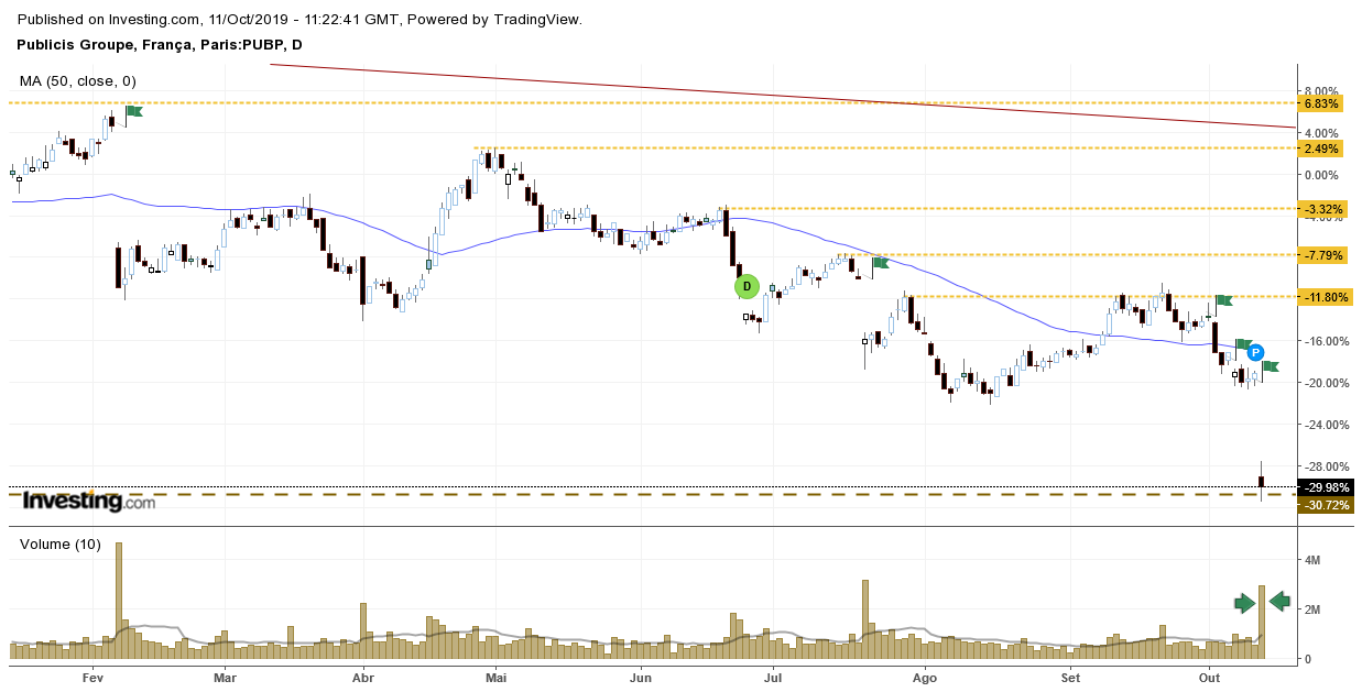 Poucos dias depois de fazer máximos absolutos, a Publicis sofreu uma forte correcção (caiu mais de 5%, em dia de resultados).
