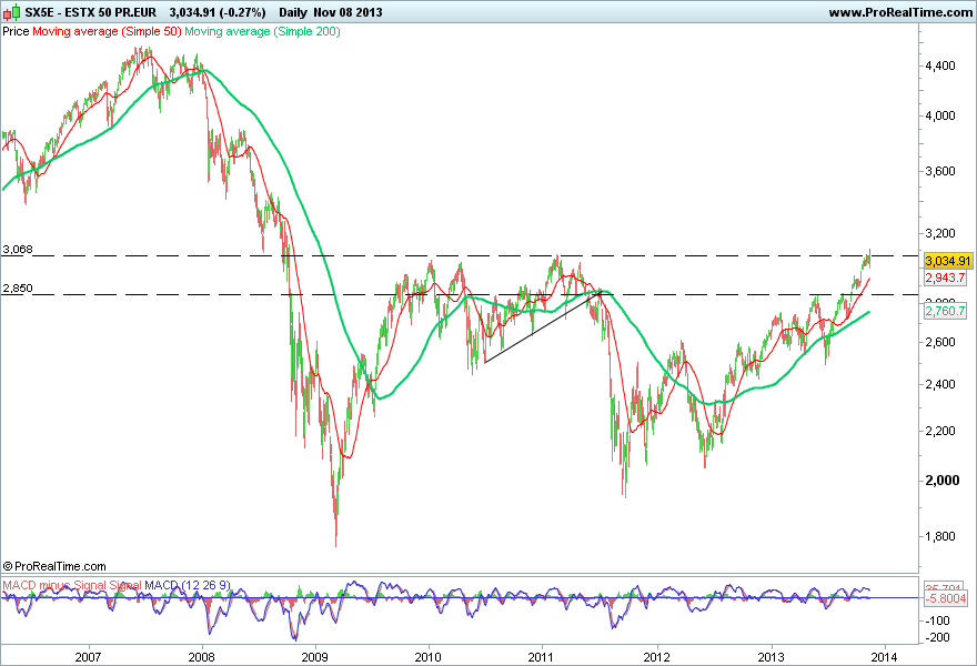 Parece que a zona dos 2850 ficou finalmente para trás. No entanto, o índice tem pela frente uma fortíssima zona resistência em torno dos 3050 pontos (grosso modo no intervalo 3020-3080). Esta zona corresponde ao megatopo que se formou em 2010 e 2011 após a crise financeira e antes da crise das dívidas soberanas.