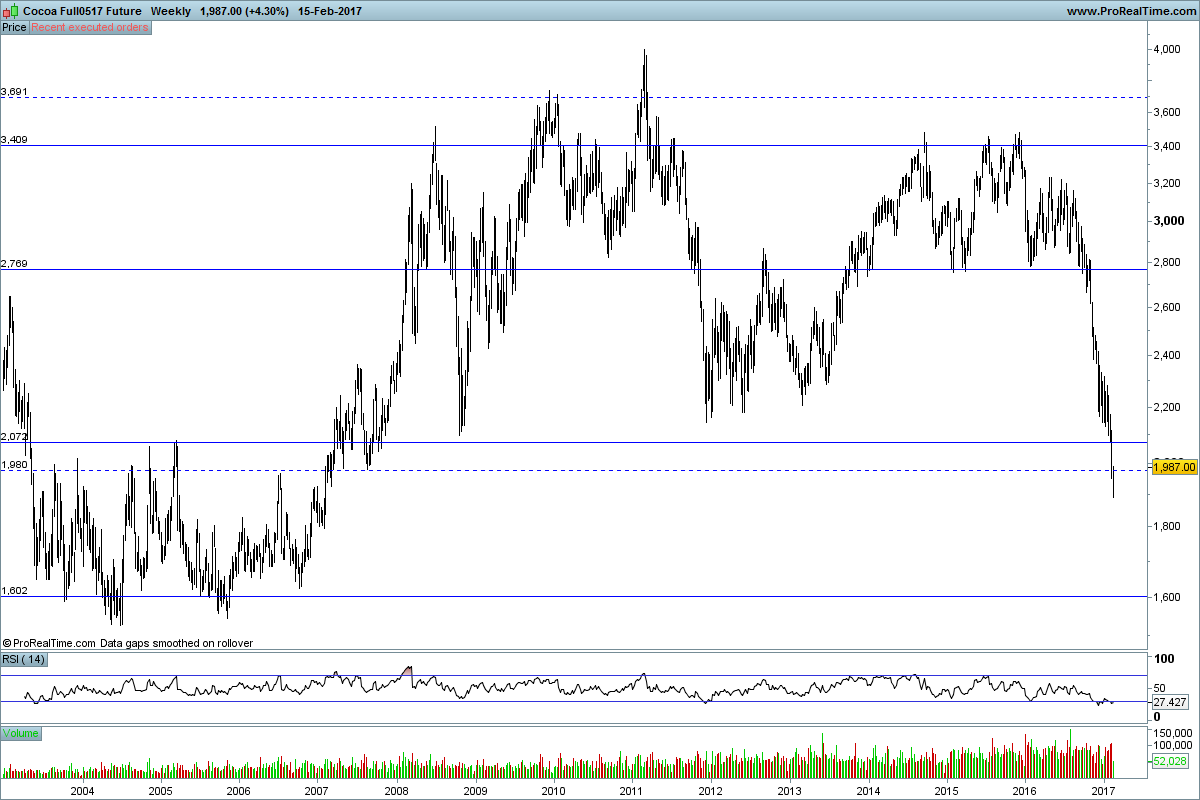 Depois de lateralizar desde Setembro de 2013, quebrou o rectângulo em baixa no final de 2016 tendo atingido ontem um mínimo de 1881$ - temos de recuar a 2007 para encontrar tal referência.