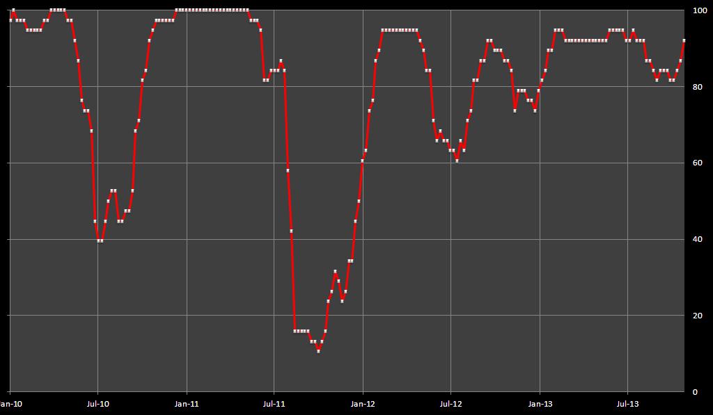 Aqui fica um gráfico actualizado, o indicador está actualmente nos 92%. Enquanto se mantiver acima dos 80% está na zona de segurança e o risco de uma "derrocada" geral dos mercados é muito baixo.