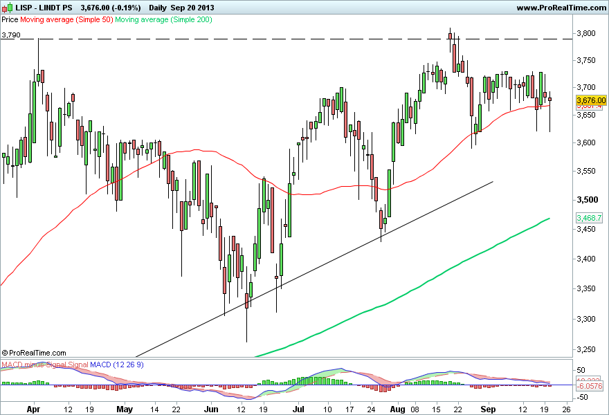 É cedo para dizer se estamos a assistir a uma inversão de longo prazo ou apenas a uma consolidação mais longa que as anteriores. Identifico contudo uma zona de suporte em torno dos 7750 pontos (cerca de 1% abaixo da cotação actual), onde houve diversas reacções em alta durante o Verão passado; se esta zona aguentar, poderá haver aqui um interessante ressalto e levar o índice de novo aos 8100 pontos (reteste à LTA quebrada); se, contudo, esta zona dos 7750 quebrar, isso será um sinal de que os vendedores tomaram conta do mercado suíço e que esta fase de bull market poderá ter chegado ao fim.