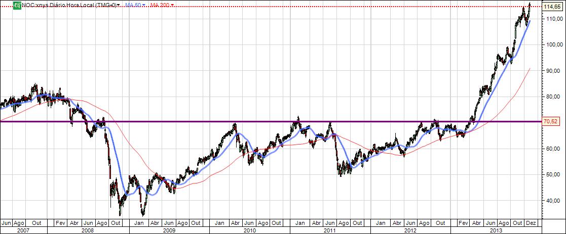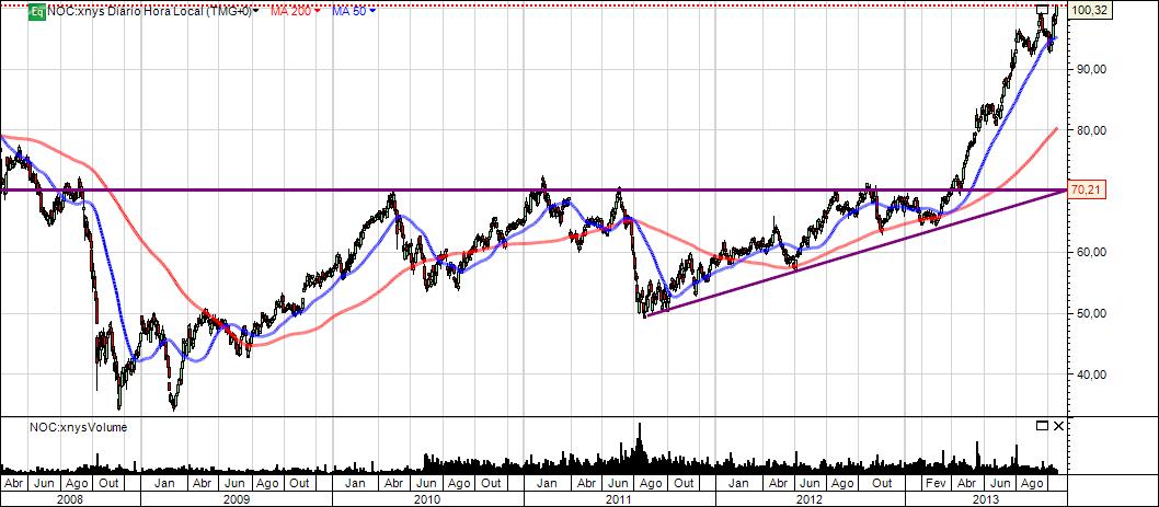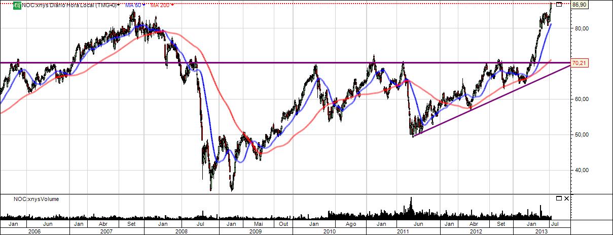 2013 está a ser um ano consideravelmente bom para a NOC. Após a quebra da sua enorme resistencia já leva mais de 20% acima da resistencia e com um movimento bastante forte sem qualquer hesitação pelo caminho.