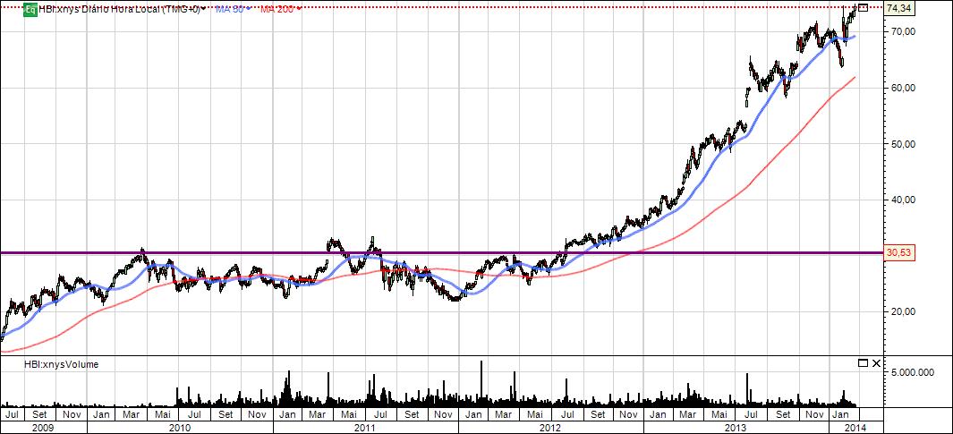 A HBI está em máximos. Com a quebra em alta da zona dos 30,65$ não mais olhou para trás e segue com uma valorização perto dos 50% acima deste valor. A vela desta semana mostrou grande força bull no título.