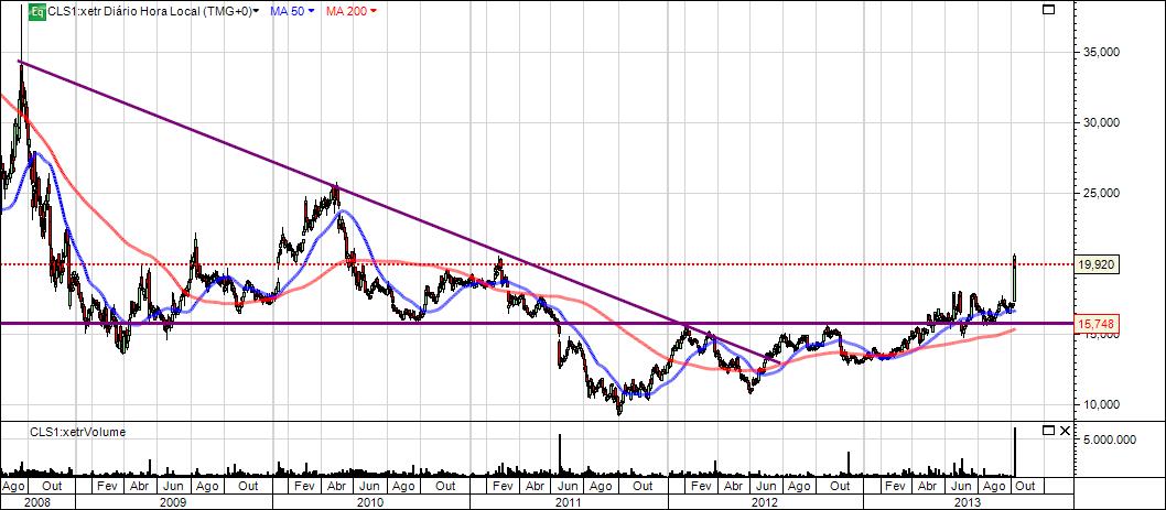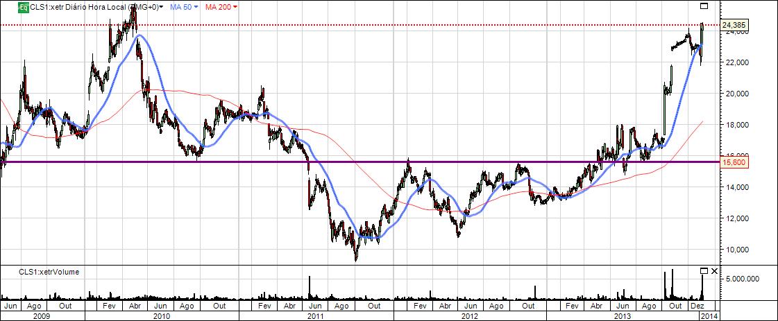 A Celesion, é parte integrante do MDax. Nos últimos 2 anos transacionou sempre abaixo da zona dos 15,75€. Teve duas tentativas de quebra em alta deste valor em 2012, mas sem sucesso. Neste momento já cota um pouco acima desta zona e sendo um possivel breakout.