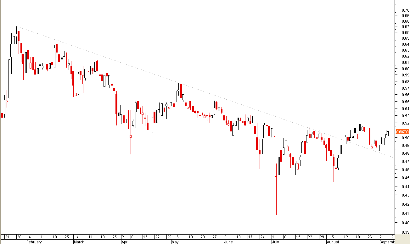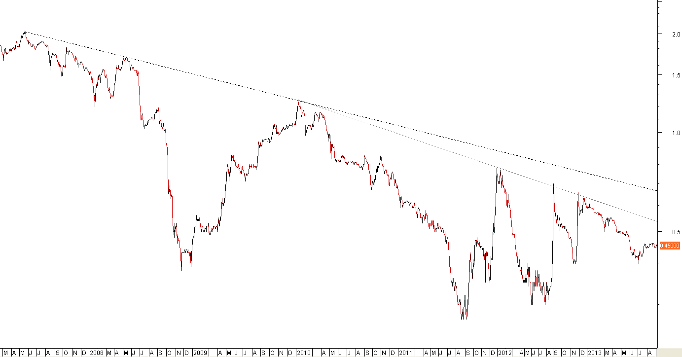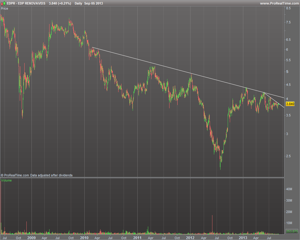 Mais ou menos isso. O busílis aqui é o ponto de saída (stop-loss) numa entrada longa. Na quebra de uma resistência horizontal podemos com alguma tranquilidade por o stop logo abaixo da R/S e está tudo bem. Num caso destes não podemos fazer o mesmo porque a cotação pode descer (em teoria para sempre) sem nunca voltar a passar para baixo da LTd. Acho que alguém comentou precisamente isto no tópico dela ou do canguru. Claro que podemos arranjar outro método para definir o stop, como a quebra dos anteriores mínimos por exemplo, mas neste caso ainda estão algo longe. Mas se quebra ali os 0,52 leva chumbo, aí leva leva.