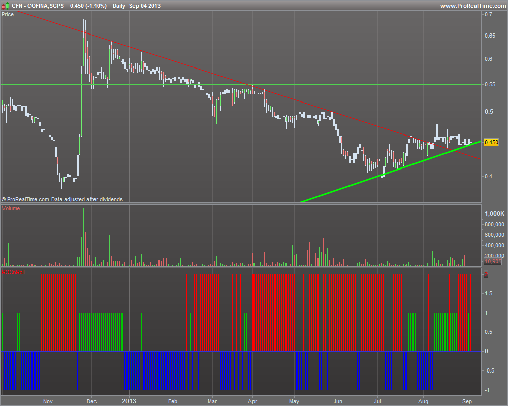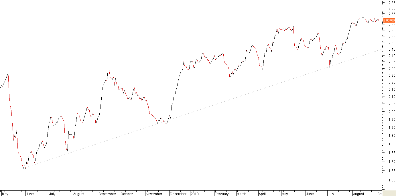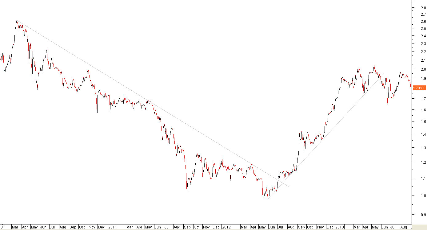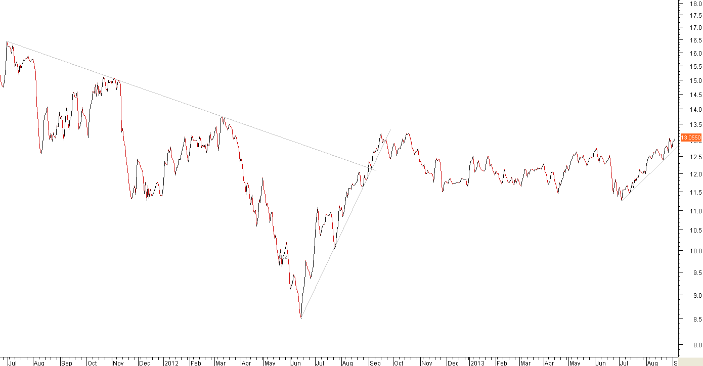 Mais ou menos isso. O busílis aqui é o ponto de saída (stop-loss) numa entrada longa. Na quebra de uma resistência horizontal podemos com alguma tranquilidade por o stop logo abaixo da R/S e está tudo bem. Num caso destes não podemos fazer o mesmo porque a cotação pode descer (em teoria para sempre) sem nunca voltar a passar para baixo da LTd. Acho que alguém comentou precisamente isto no tópico dela ou do canguru. Claro que podemos arranjar outro método para definir o stop, como a quebra dos anteriores mínimos por exemplo, mas neste caso ainda estão algo longe. Mas se quebra ali os 0,52 leva chumbo, aí leva leva.