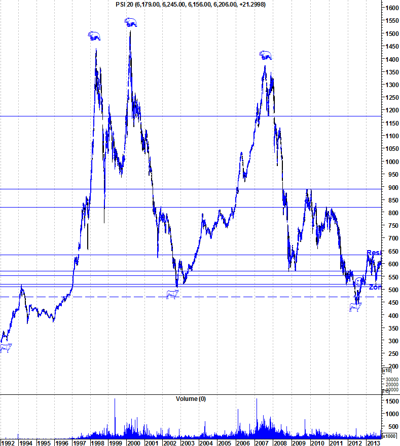 Desde os máximos de 2007 até aos mínimos do "bear market", o Sonae SGPS ( a acção "grande barómetro") caiu mais que o PSI20, o "normal", a primeira +-80% e o PSI20 pelos +-70%, neste momento após as subidas do ano passado o PSI20 está +- 120% dos máximos de 2007 e a Sonae SGPS a +-80%., e como referes "Nas acções, se escolheres as certas, baterás o índice", e quando se confirmar a ruptura dos 6350/6400 pontos consistentemente da reforçar o "bull market", isto poderá indicar que Sonae SGPS não terá um desempenho superior ao PSI20 ou será superior... :roll: :wink: (claro que não se deve fazer futurismos, será possível tirar alguma conclusão! :?: