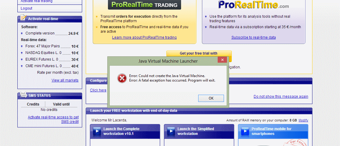 Following this update, ProRealTime users have been unable to launch the platform as normal, citing the error message "Could not create the Java Virtual Machine".