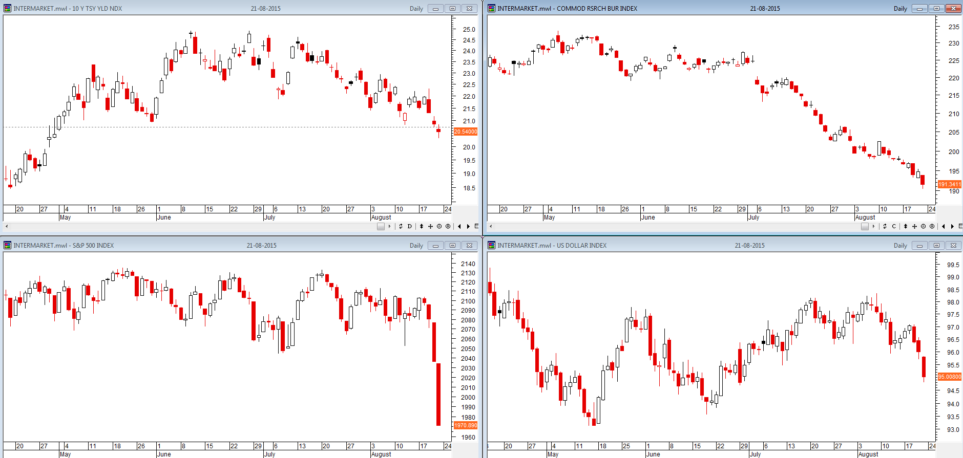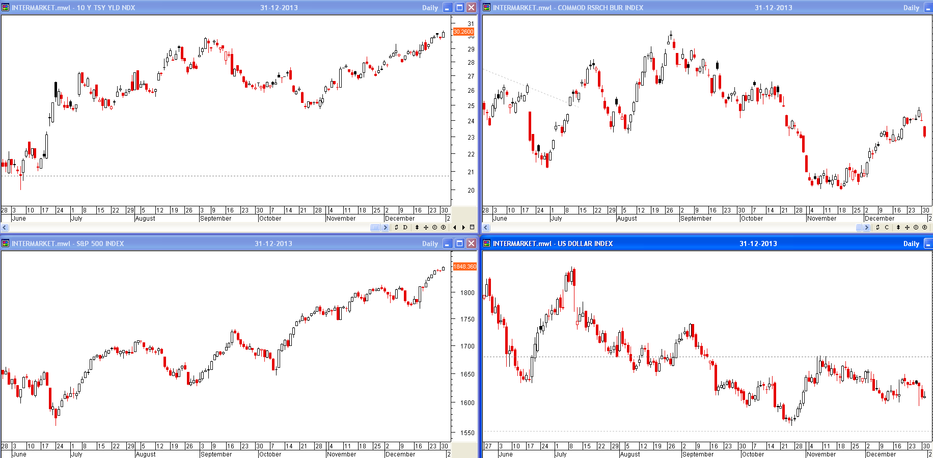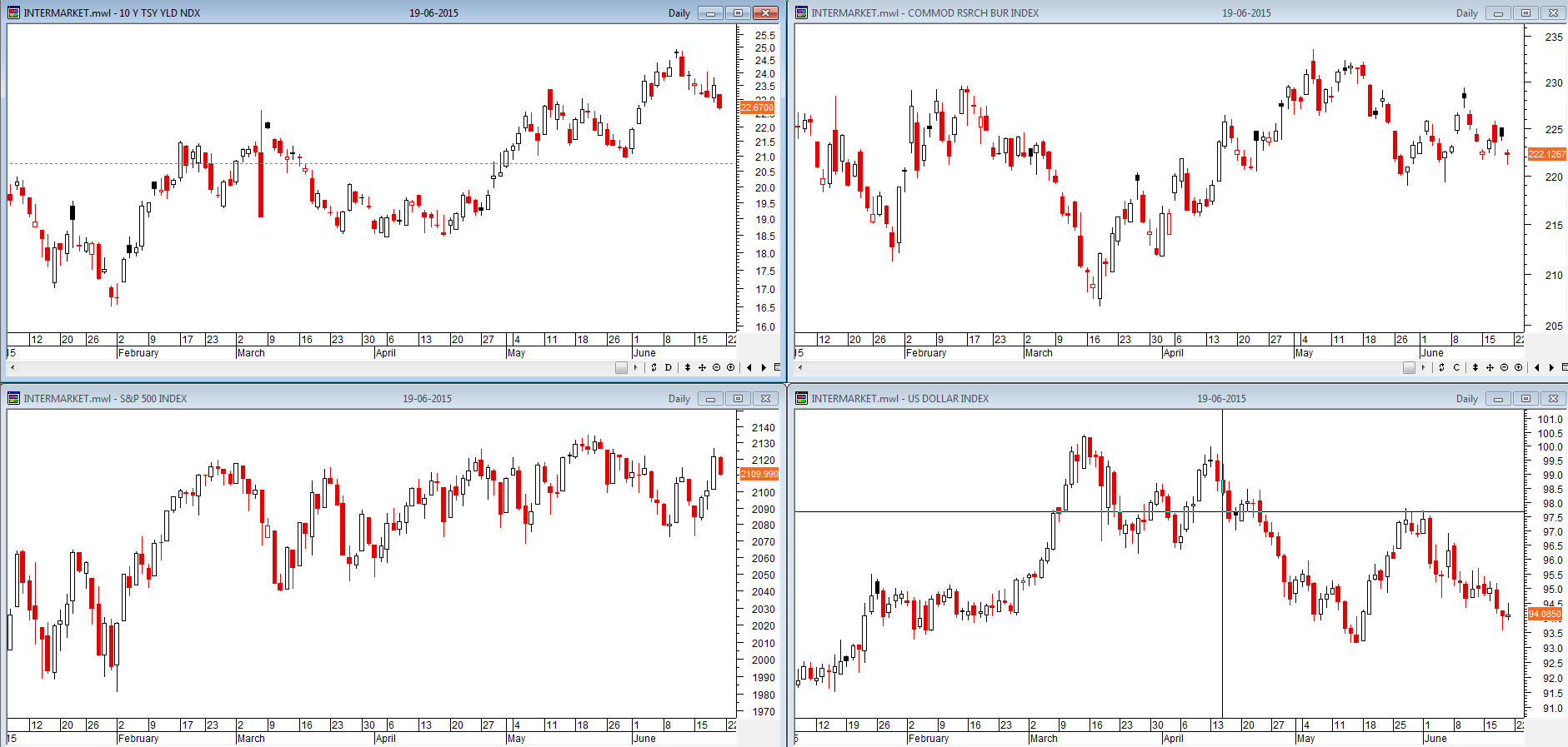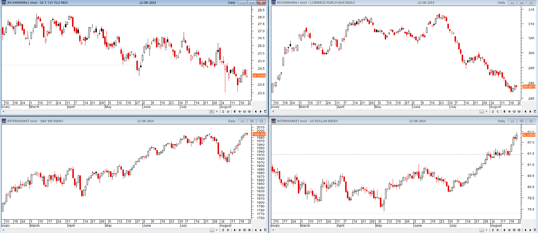 no sentido dos ponteiros do relógio, temos as yields norte-americanas a 10 anos, o índice norte-americano das mercadorias, o dollar index e o S&P 500