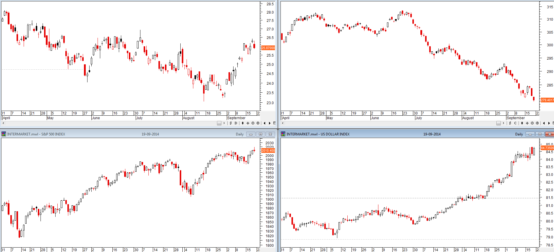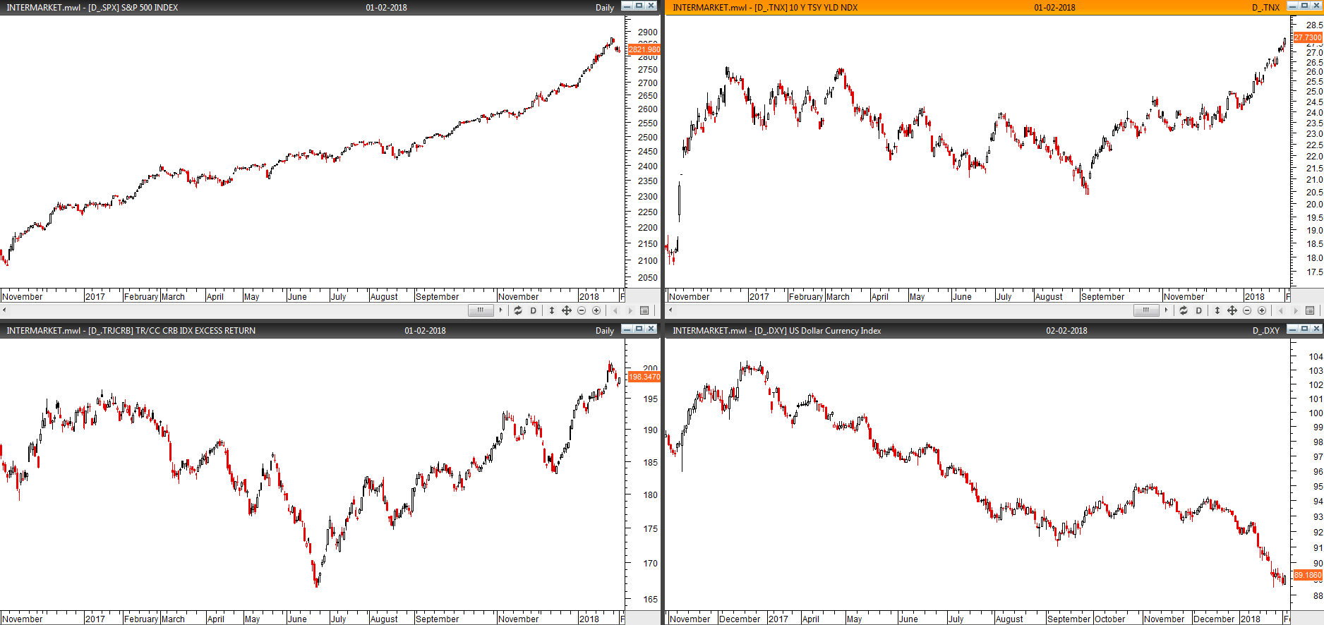 no sentido dos ponteiros do relógio: S&P, yields USA a 10 anos, dollar index e commodities
