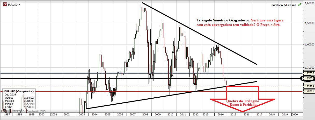 Assim, mantém-se a tendência de apreciação do USD (sim, este é o tópico certo para o EUR/USD e todos os outros) face à larga maioria das divisas. Face ao JPY, ainda está longe dos máximos, mas face ao EUR, pode atacar os máximos. O gráfico acima do nosso amigo Anthimio tem muito interesse e aquele triângulo deve ser tomado em consideração. O EUR/USD ainda está numa posição muito frágil e em condições de testar suportes bem antigos.