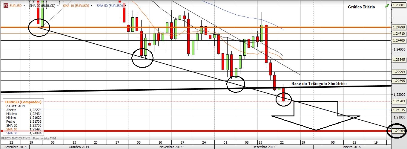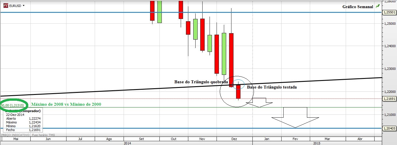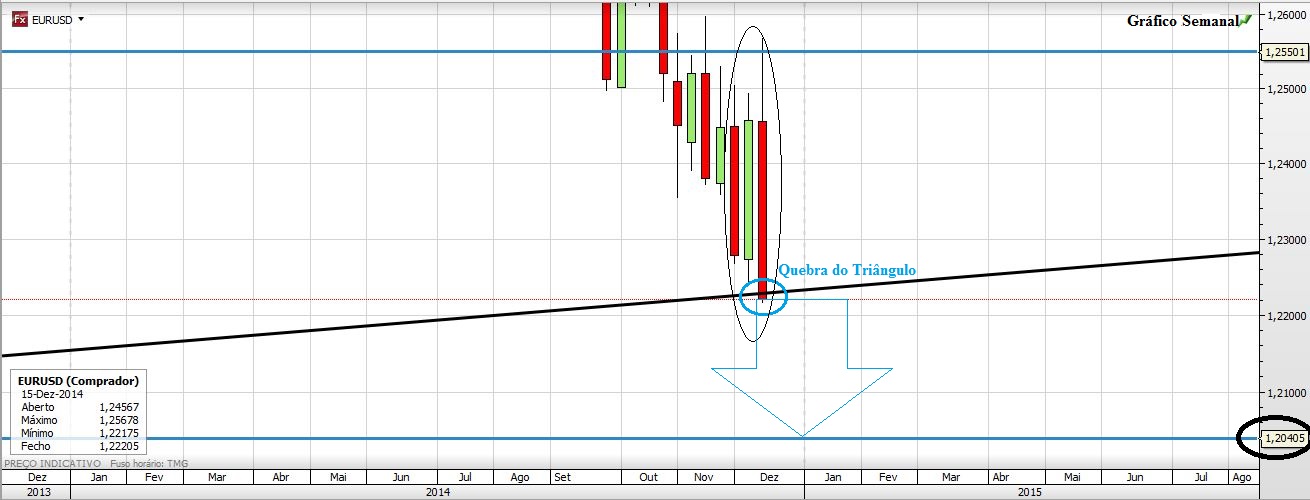 O EURUSD deu início às festividades no que à quebra do Triângulo Simétrico diz respeito. Tanto no Gráfico Diário, como no Semanal o Preço fechou abaixo da linha inferior do Triângulo. Isto é significativo. Também de referir o padrão de velas no semanal: Uma sandoca das boas para quem gosta e, para quem preferir, um Bearish Engulfing. Para mim o mais importante é mesmo a quebra daquela linha e o fecho abaixo da respectiva nos dois time frames que referi.