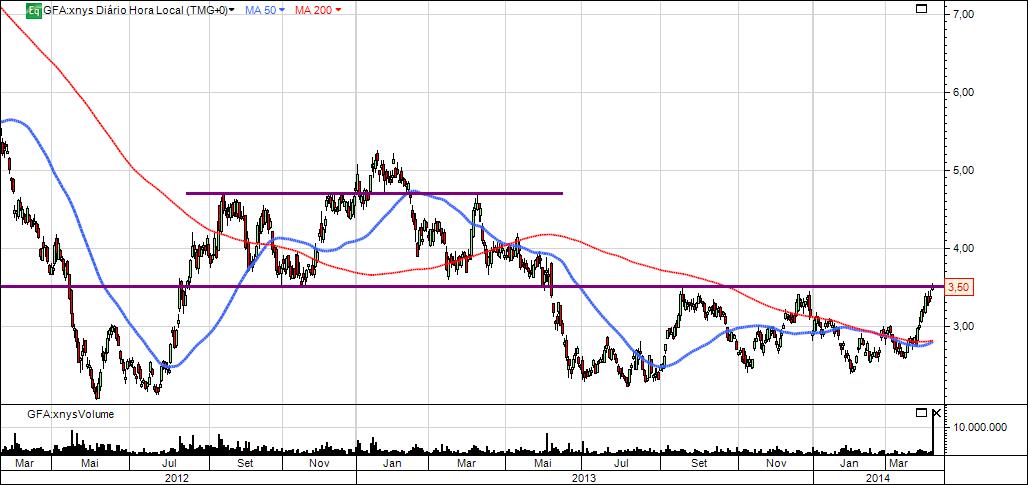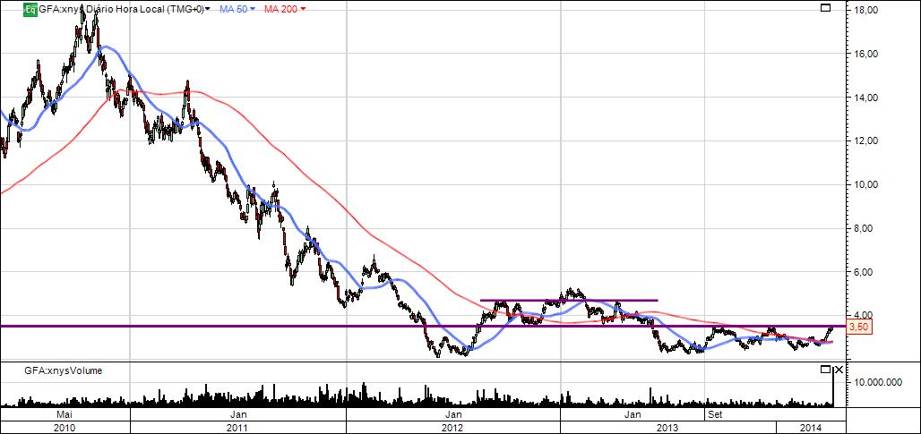 Depois de um BearMarket violento iniciado no segundo semestre de 2010, a GAFISA teve no início de 2013 um primeira tentativa de inversão de tendência pela quebra dos 4,50$. Falso alarme que a levou a fazer um reteste ao suporte na zona dos 2,20$.