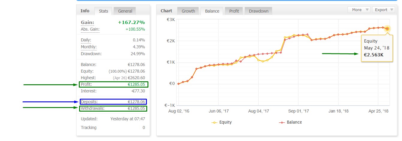 Neste quase dois anos de negociação, e com ajuda de um trader profissional, consegui um balanço positivo de 1285,05 Euros (+100.55%), ficando com um saldo total da conta de 2563,11 Euros.