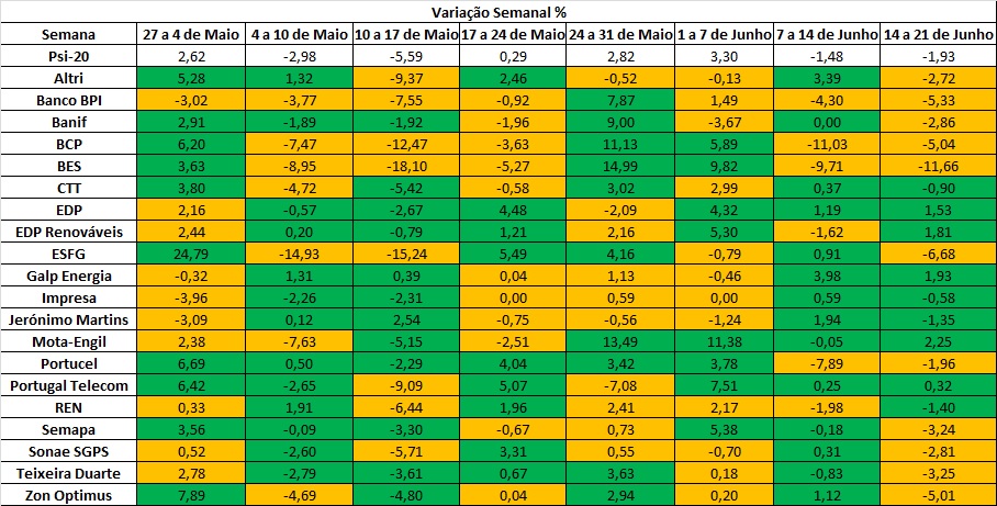 Do lado negativo esteve toda a banca, em especial o BES depois de uma semana atribulada, com a saída de Ricardo Salgado, depois de 22 anos de liderança do grupo. O novo CEO é uma cara conhecida de todos, mas o futuro é incerto. Ainda está semana Ricciardi disse que pretende separar o BESI do BES.