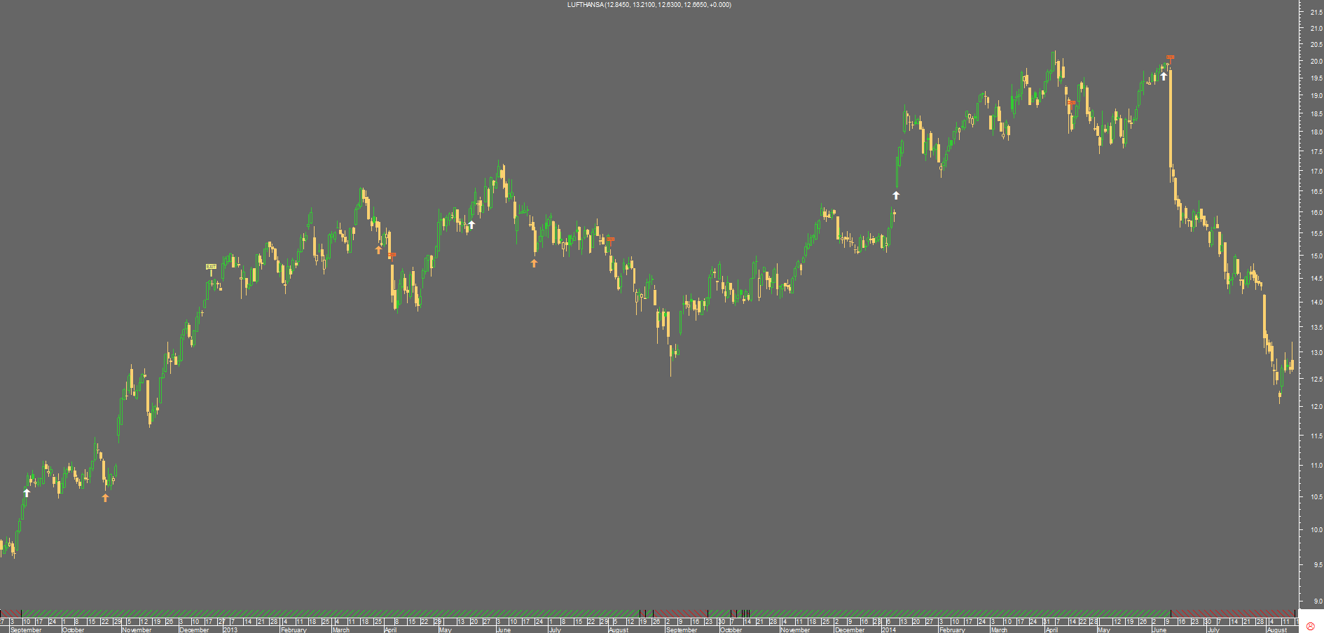 rsacramento Escreveu:deixo um exemplo gráfico com a edp: seta branca é ordem de entrada, sinal de exit é para fechar a posição; obviamente o trailing stop está a laranja