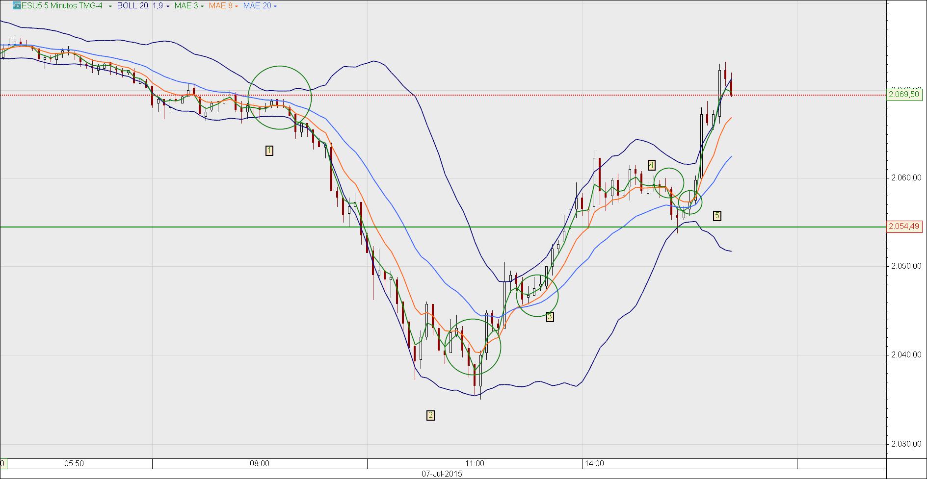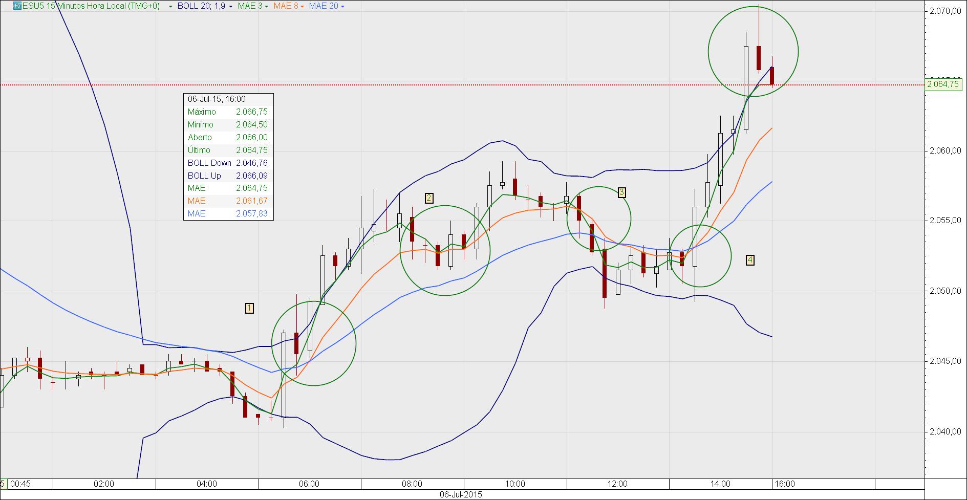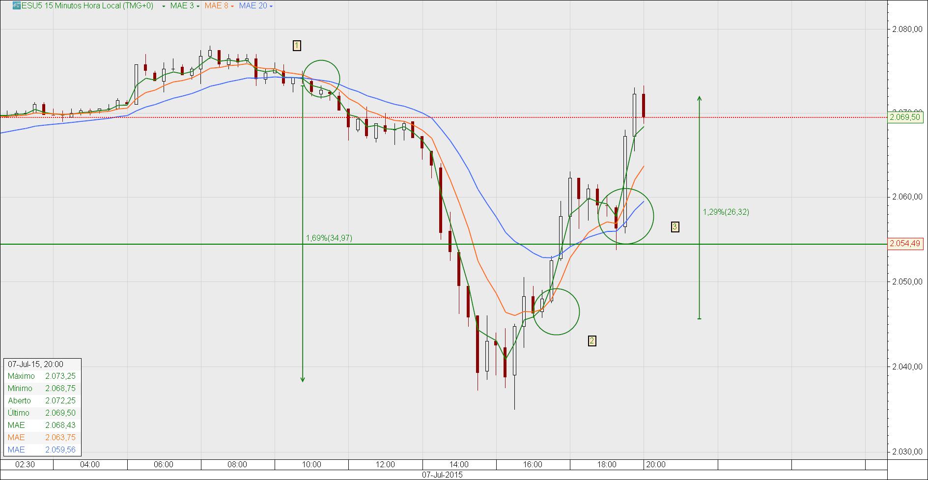 Magnifico e espetacular. Produtivo simples objetivo pratico com um custo mínimo de tempo de cálculos e reflexões . O setup das 3 médias exponencias de 3,8,20 com a 3 em cima a 8 no meio a de 20 abaixo dentro do corpo do candle é o sinal de entrada e as três médias novamente a de 3, 8 e 20 com a de 20 acima com a de 8 ao meio e a de três abaixo dentro do corpo do candle é o sinal de saída. Com a continuidade de operações pode-se observar uma série clara de variações que conduzem também a consideração de ser um sinal. Não é necessário experimentação pois o setup não altera-se é necessário observação. Os tempos gráficos de 15 e 5 minutos são extremamente precisos também podemos utilizar o tempo gráfico de 5 e 1 minuto. O setup e o ativo da classe futuros agora sei foram feitos um para o outro em day trading. Os futuros também possuem uma característica de poderem ser negociados praticamente 24 horas ao dia, gap-ups ou gap downs nas diversas aberturas do mercado global e a cada abertura e o fecho daquele mercado oscilações ocorrem e ai poderemos fazer uma enorme diferença. O futuro ESU5 mini SP500 é o dono desta festa entretanto não posso dar mais opiniões sobre futuros porque é a primeira vez e não será a ultima. O mais importante aqui é que o ativo escolhido para utilizar-se as medias 3, 8, 20 deve possuir alto volume de negociação. É a condição fundamental.