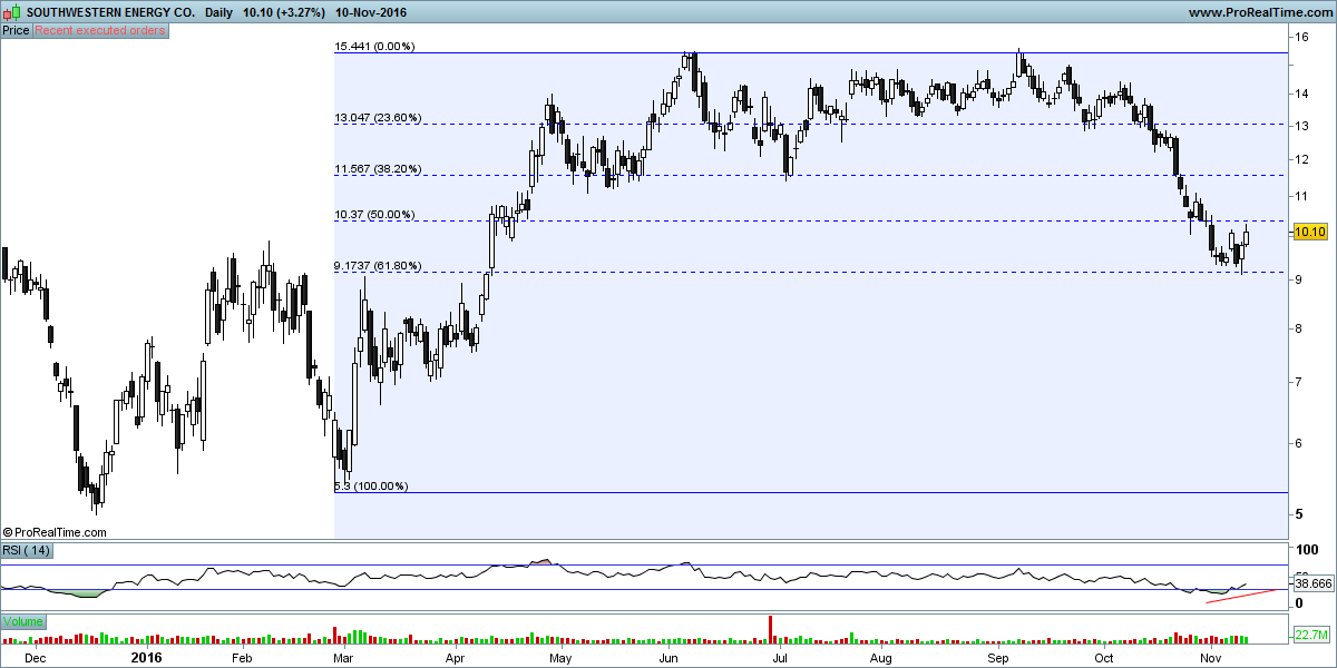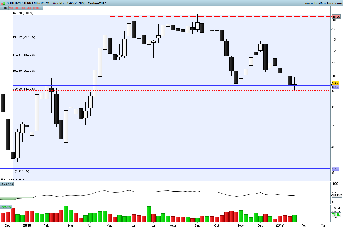 SWN próxima de mínimos de 2015 e 2016, RSI "oversold" no diário e semanal.