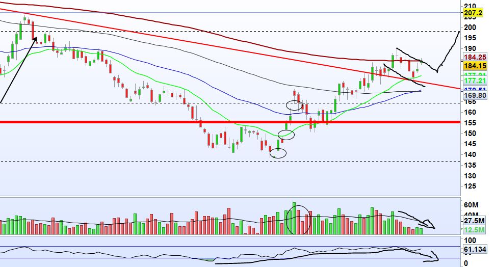 Faz falta uma consolidação para ter força em derrubar a MME200. A projecção do IHS faz-se na zona dos 200.