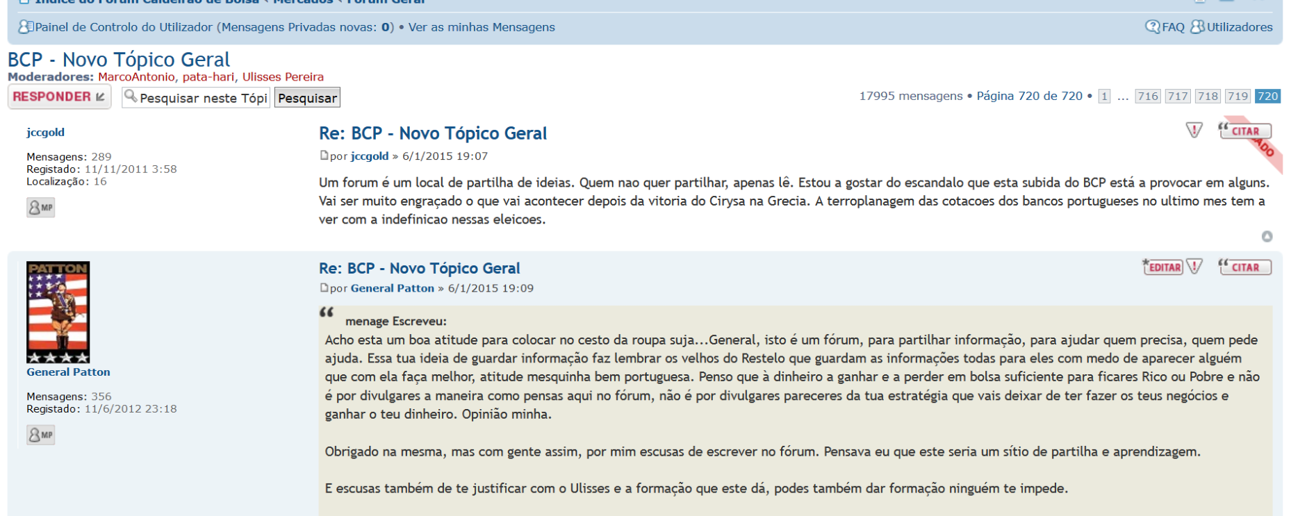 Tinha 356 posts antes deste mesmo que agora publico (que seria o 357.º). Depois de teres bloqueado o tópico do BCP, eliminaste um dos meus posts e não me deste conhecimento disso, sem me avisares do lugar, da data e da hora em que o mesmo se situava no fórum.