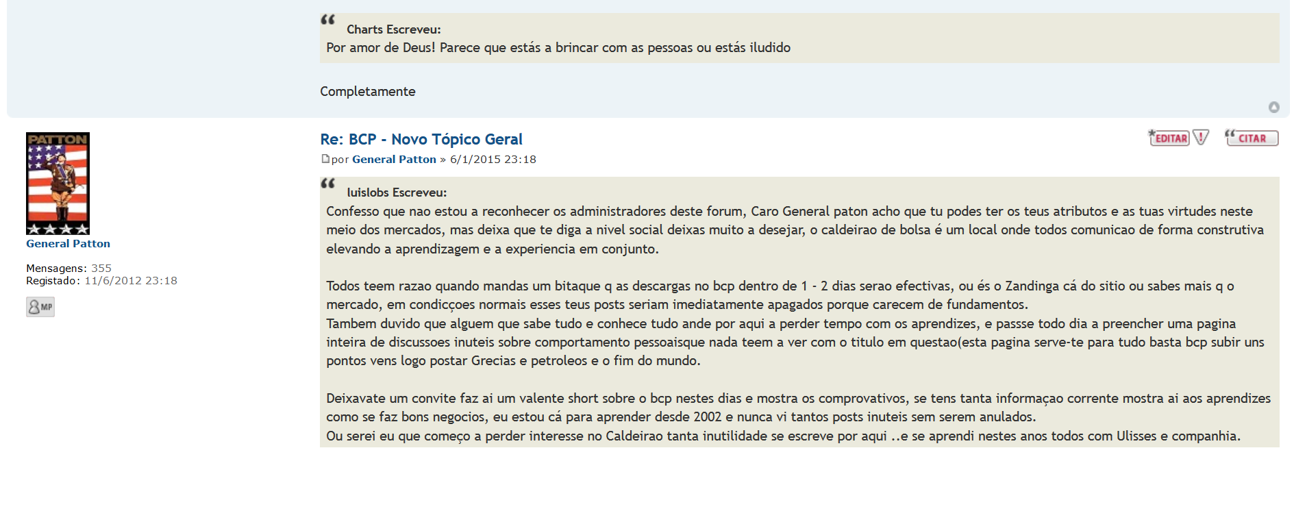 Antes de mais, quero informar-te do que já sabes: apagaste-me um post sem que disso me desses conhecimento através de qualquer uma das formas possíveis. É certo que enquanto administrador do fórum, tens o direito de estabelecer a ordem, mas não pode esse direito ser exercido sem o conhecimento do forista autor de um qualquer post que seja eliminado. Os direitos de autor sobre o post eliminado não te pertencem de forma alguma. Há interesses que podem justificar a sua eliminação, mas terás de dar conhecimento ao autor sobre esse procedimento, indicando a data, hora e o lugar em que se inseria relativos ao post apagado. De outra forma, o que fazes é manipulação de um fórum que diz pretender colaborar para o cabal esclarecimento do público sobre os mercados financeiros. Essa atitude deixa muito a desejar em relação a esse intuito que tanto defendes!