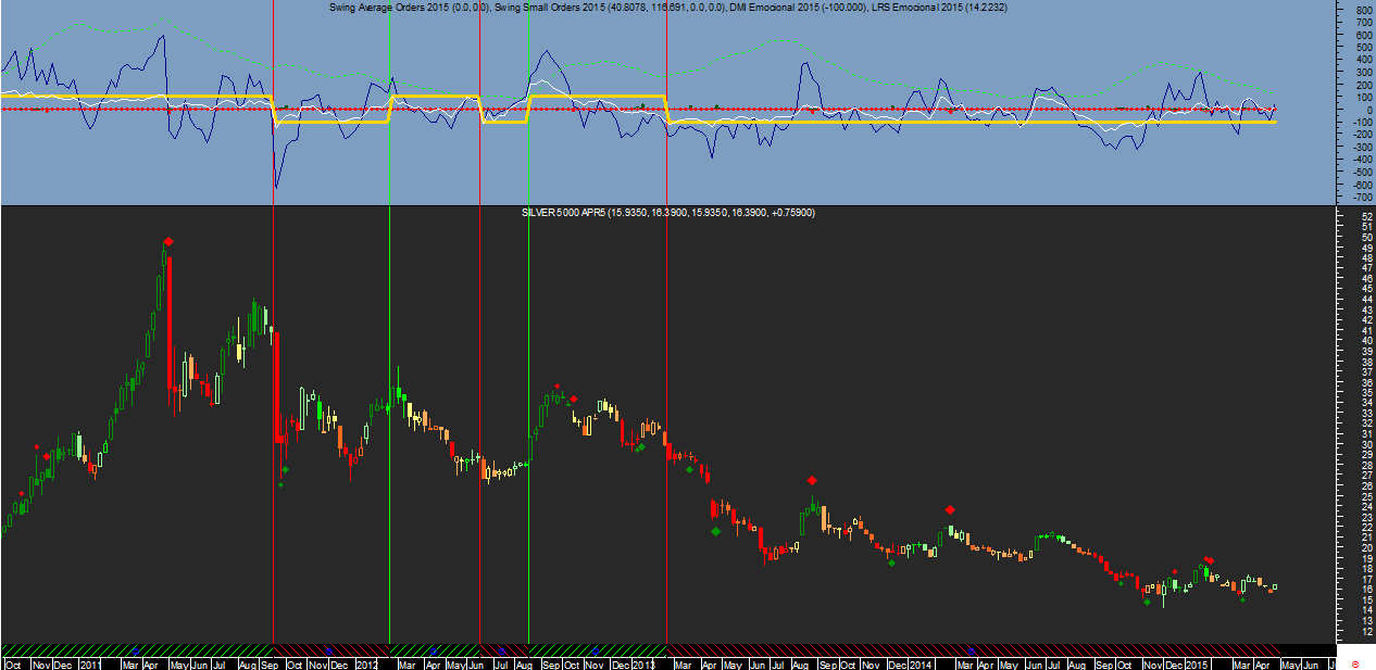 2) Silver: atualmente neutro. No gráfico semanal o sinal de compra encontra-se bastante próximo de ser disparado. Se por acaso no final da semana que vem a Prata estiver acima da zona dos 17.65 aos 17.75 é mais que certo que o atual sinal de venda semanal na Prata, que já está em vigor desde fevereiro de 2013 ao valor dos 28.45, passará finalmente a uma compra e dessa forma permitirá que o programa assuma finalmente este ano uma posição longa neste metal.